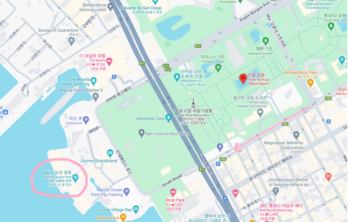 마닐라 오션 공원 가는 길은 저 핑트색 화살표쪽 길로 걸어서 가고 있었어요 ㅜㅜ